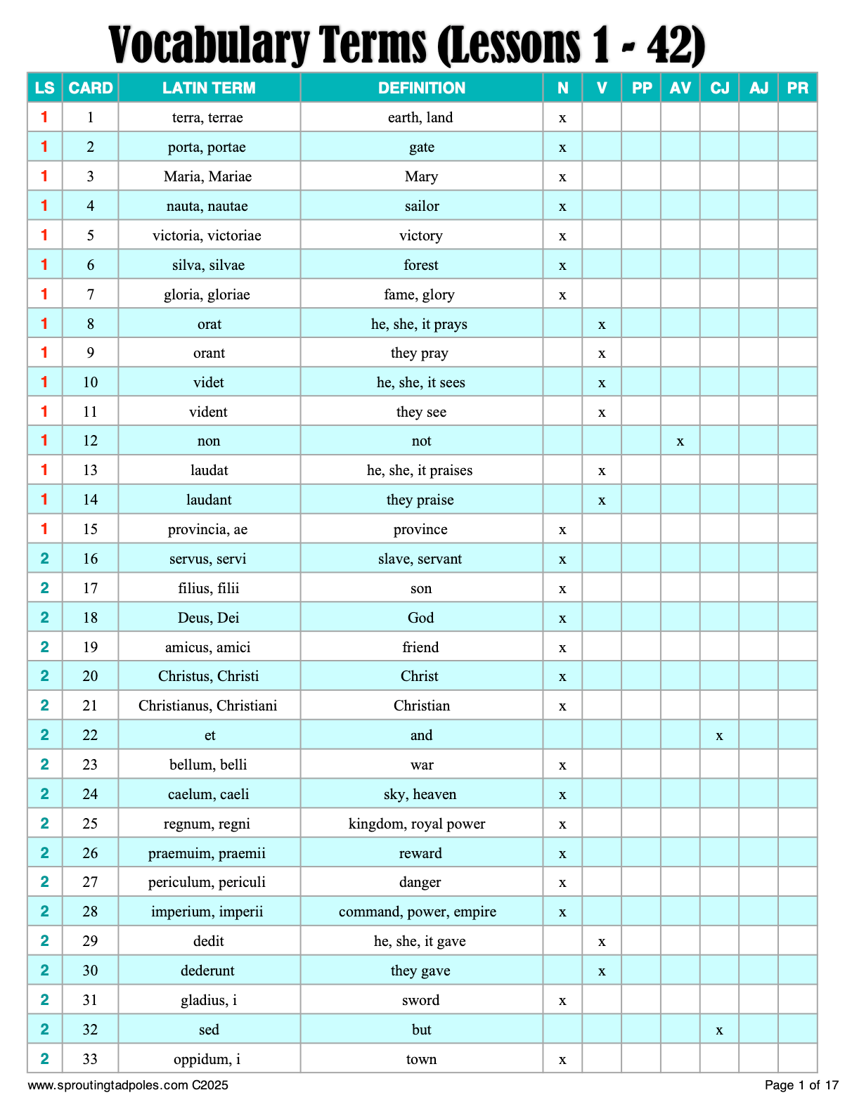 Latin Vocabulary Terms Lessons 1-42 - includes vocabulary cards & reference charts for lessons 1-42 (all 497 vocabulary terms)